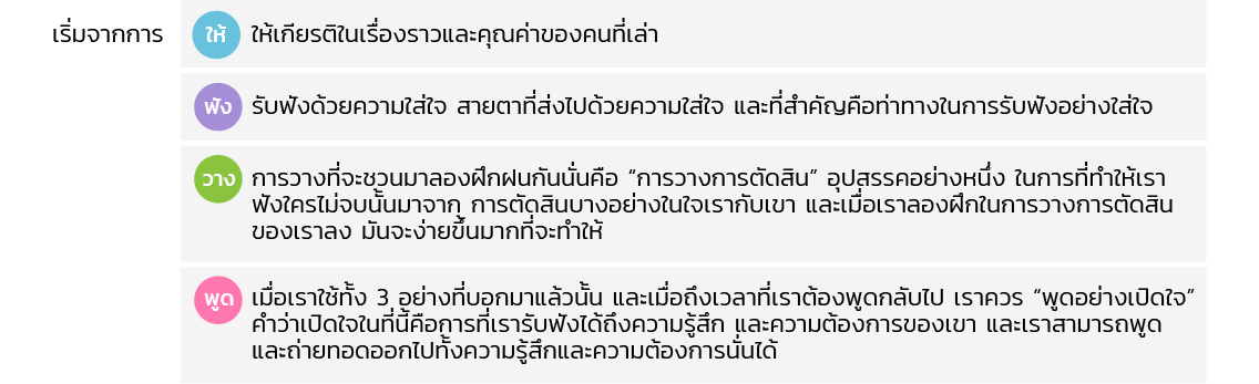 เราเคยตั้งคำถามกับตัวเองกันบ้างไหมว่า “การรับฟังที่แท้จริง นั้นคืออะไร” บางครั้งเราอยู่ด้วยกัน แต่เหมือนว่าไม่ได้อยู่ด้วยกันเลย เพราะเวลาที่เราพูดบางอย่างออกไปเราหวังว่าคนที่อยู่ตรงหน้าจะรับฟังในเรื่องราวของเรา ให้เหมือนว่าเรามีเพื่อนอยู่ตลอดทางของการสนทนา เพราะความเป็นจริงแล้วสำหรับบางคนไม่ได้ต้องการให้ใครช่วยหาทางแก้ หรือทางออกให้ แต่เพียงแค่ต้องใครสักคนที่รับฟังเรื่องของเขาอย่างแท้จริง และบางทีเขาอาจจะไม่ต้องพูดอะไรกลับมาเลยก็ได้ ขอเพียงแค่ท่าที และสายตาที่ใส่ใจเราตลอดทั้งการรับฟัง